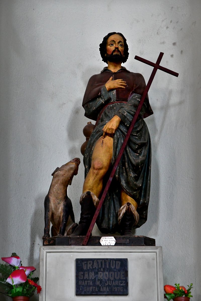 Nous retrouvons San Roque, en habit de pèlerin. Il retrousse sa robe et montre le bubon de peste sur sa cuisse. Le chien qui lui a sauvé la vie en lui apportant du pain volé à son maître Gothard est à ses côtés.