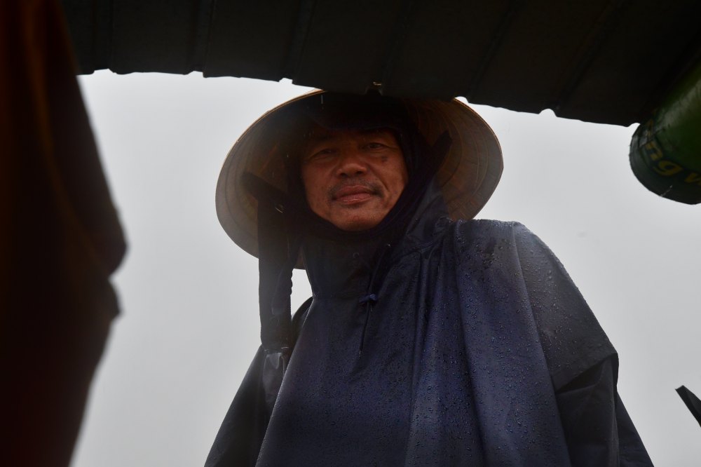 Pilote sur la Rivière des Parfums à Hué. Vous avez remarqué, il pleut.