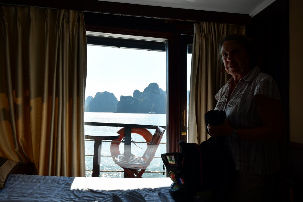 Cabine de la jonque "Image" qui nous a emmenés sur la baie d'Halong. Elle possède 9 cabines climatisées, une salle à manger et un vaste pont aménagé pour profiter du paysage.