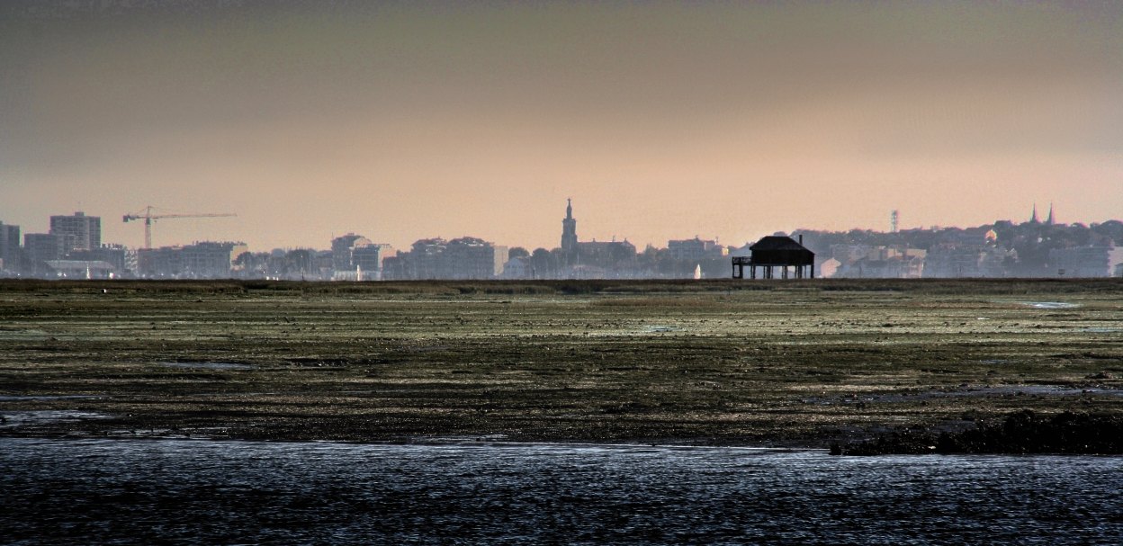 L'Ile aux Oiseaux vue du Piraillan avec les bancs de vase en premier plan et la ville d'Arcachon en fond.