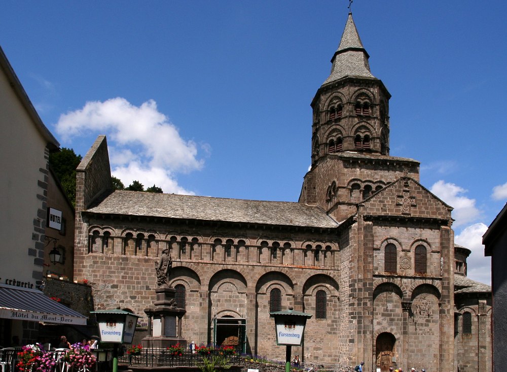 La Basilique Notre-Dame d’Orcival a été construite au 12ème siècle par les moines de l’abbaye de la Chaise Dieu en Haute-Loire. L’édifice a été partiellement détruit par un tremblement de terre au 15ème siècle et a été incendié lors de la Révolution Française. La Basilique héberge une « Vierge Noire » placée sur une colonne, derrière l’autel. Les chaînes et les boulets accrochés aux murs extérieurs sont des ex-voto de prisonniers délivrés par son intervention divine.
