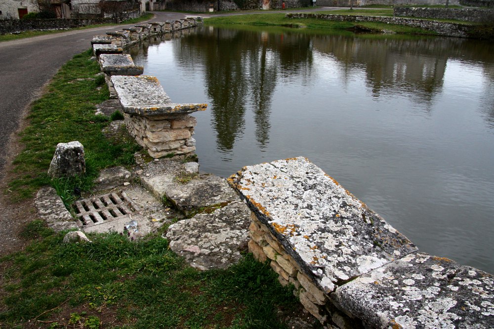 Lavoir à ciel ouvert à Aujols, dans le Lot. Ce lavoir ne comporte pas moins de 24 tables de lavage disposées autour une pièce d’eau sur la place du village.