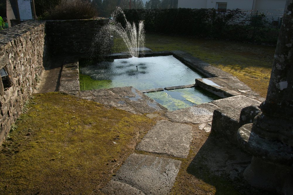 Le lavoir de la Chapelle Neuve, dans le Morbihan, est alimenté par une fontaine qui le surplombe. Le jet d’eau au milieu du grand bassin est un élément décoratif récent.