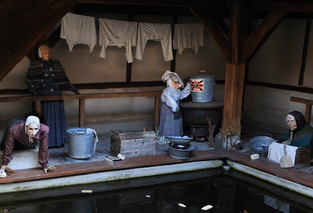 Notez la présence d’une lessiveuse de la marque « L’abeille » sur la chaudière, dans le coin du lavoir. Si celle-ci est, certes, contemporaine de la scène décrite, sa présence sur la chaudière est incongrue. On utilisait soit la chaudière, soit une lessiveuse sur un feu ouvert mais pas des deux appareils posés l’un sur l’autre. La chute d’une des chemises sur la tête de la lavandière est probablement accidentelle.