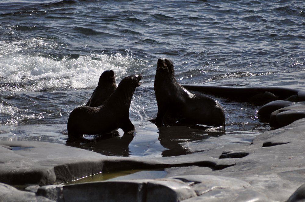 Affrontement de phoques léopards sur les rochers.