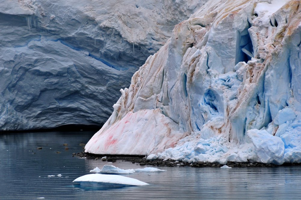 La base chilienne Gonzalez Videla est encadrée par les impressionnantes langues glacières qui bordent le continent antarctique. Notez, sur la glace bleue, les traces rouges signe de la présence de manchots.