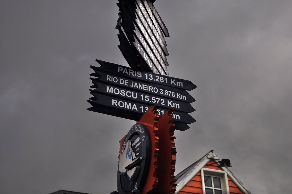 Panneau des distances devant la maison des pionniers, la Bodegon Fueguino, au 159 de la rue San Martin.