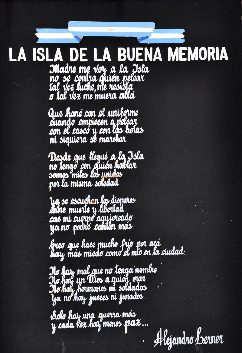On retrouve dans pratiquement tous les lieux publics argentins ce genre de poèmes à la gloire des combattants des Malouines accompagnés de revendications sur les territoires occupés par les Britanniques.