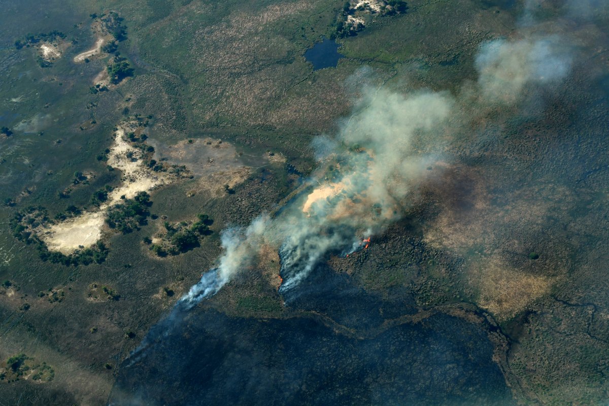A la fin de la saison sèche les bras du delta de l'Okavongo sont, pour ainsi dire, à sec. Les feux de brousse apparaissent.
