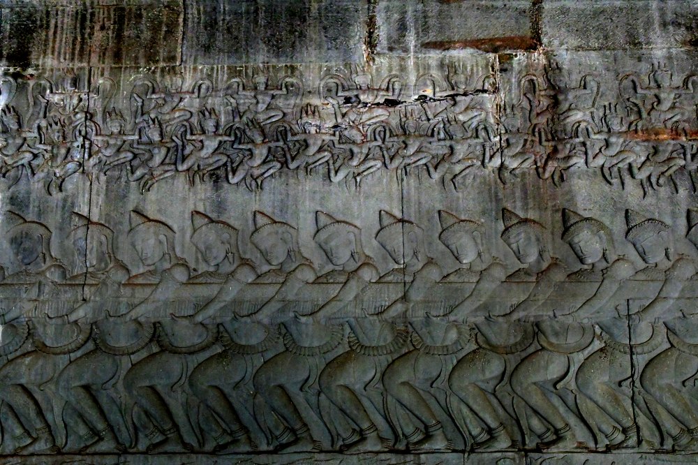 Les deva ou dieux, à la coiffe conique, tirent sur la queue du serpent.