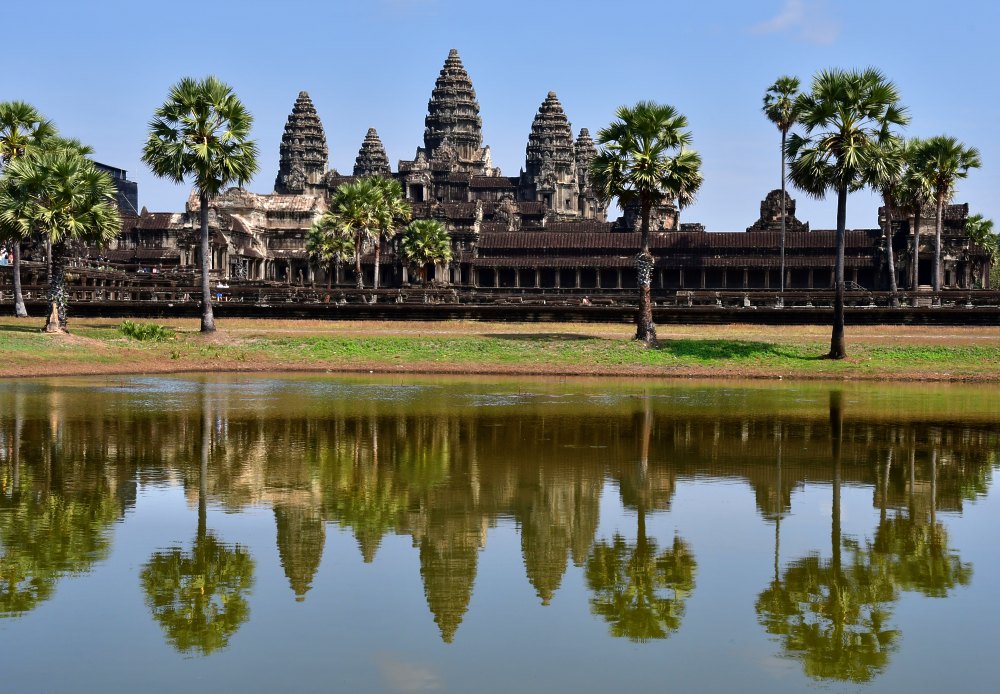 Vue générale du temple d'Angkor. On voit bien la tour centrale représentant le mont Meru et les quatre tours annexes.