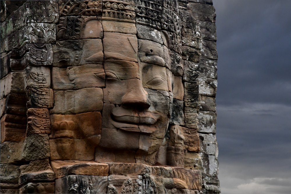 Une des têtes monumentales du Bayon à Angkor Thom.