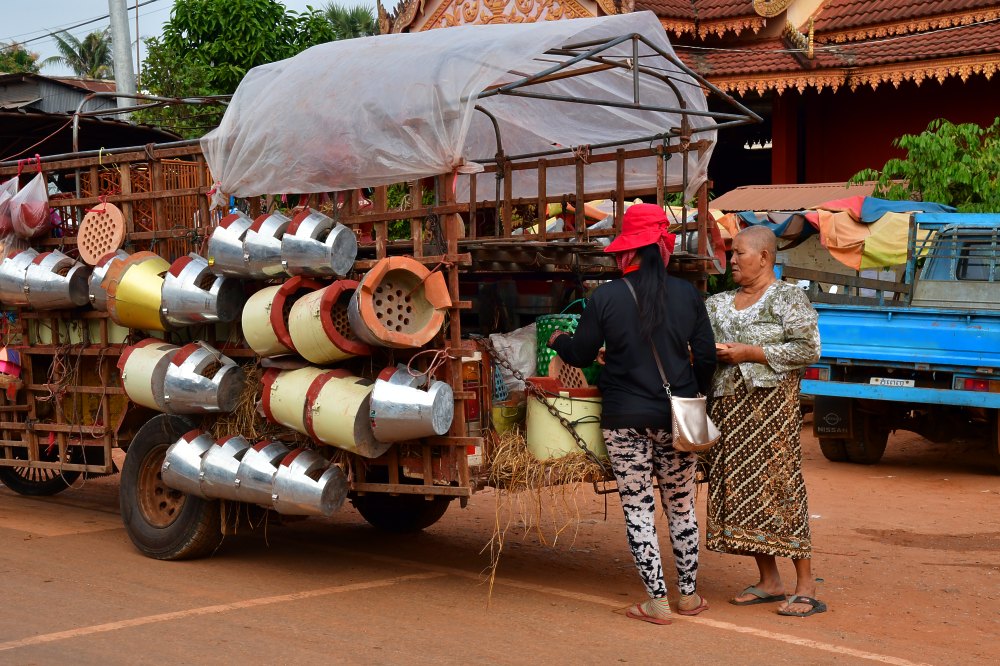 Les étalages ambulants, tirés par une mobylette, peuvent être impressionnants. Ici, un vendeur de pots et gamelles.