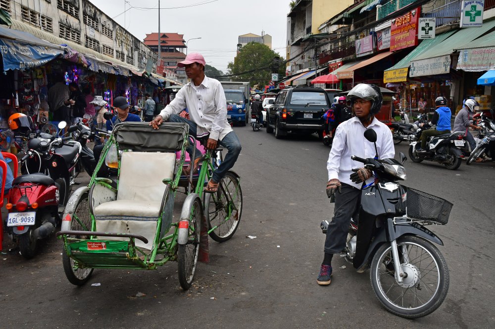 Pousse-pousse dans les rues de Phnom Penh. Peu cher mais, il faut le dire, peu efficace.