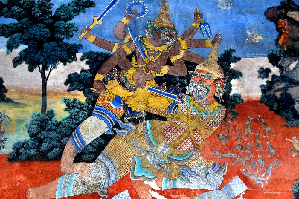 Hanuman terrasse le démon. Il lui a coupé le bras. De petits démons s'échappent par la blessure.