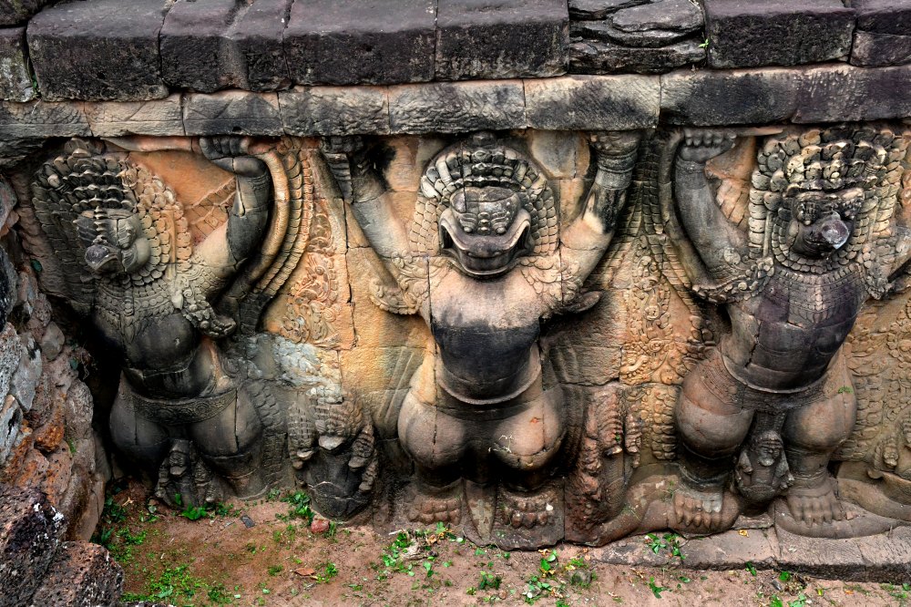 Au centre, des garuda, mi-homme, mi-aigle, en position d'atlantes soutiennent l'escalier principal.