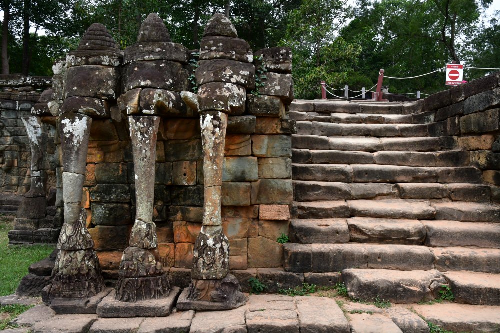 Six éléphants, trois de chaque côté, gardent l'escalier central. Ils cueillent avec leur trompe des fleurs de lotus.
