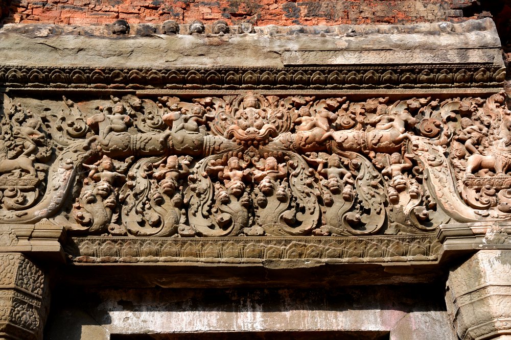 Linteaux finement travaillés. De la gueule du kala sort un naga aux têtes multiples. Guerriers et divinités évoluent dans un univers végétal.