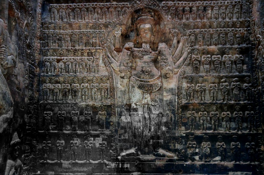 Vishnu à huit bras, debout, entouré de 89 adorateurs.