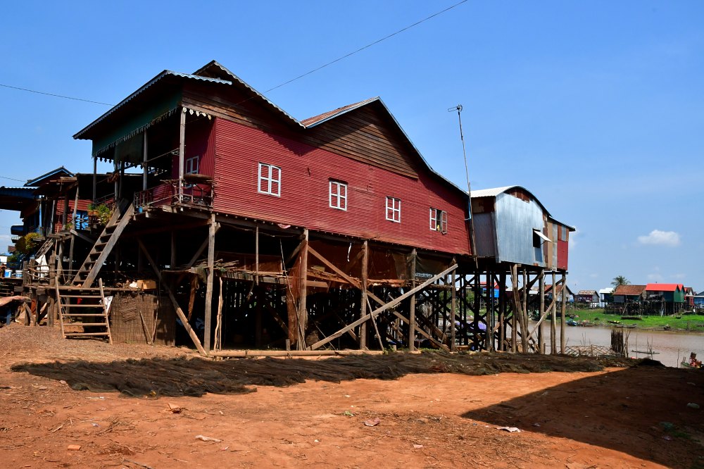 En approchant des rives du Tonlé Sap, les maisons sur pilotis sont encore plus hautes.