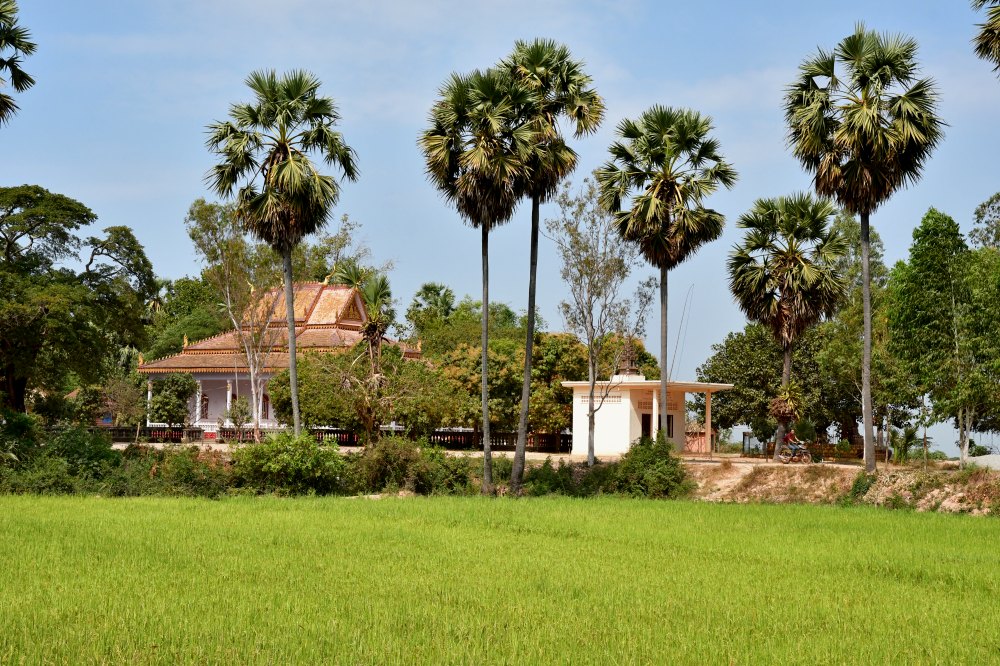 Palmiers à sucre et rizière autour d'une pagode locale.