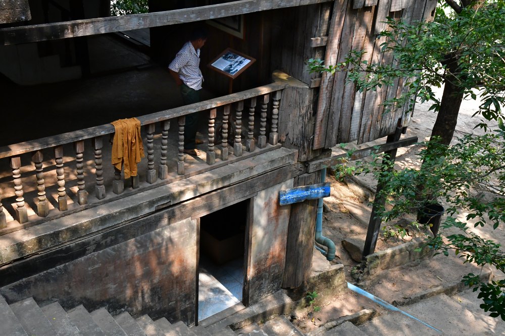 Un visiteur lit attentivement la biographie d'un des dignitaires Khmers Rouges.