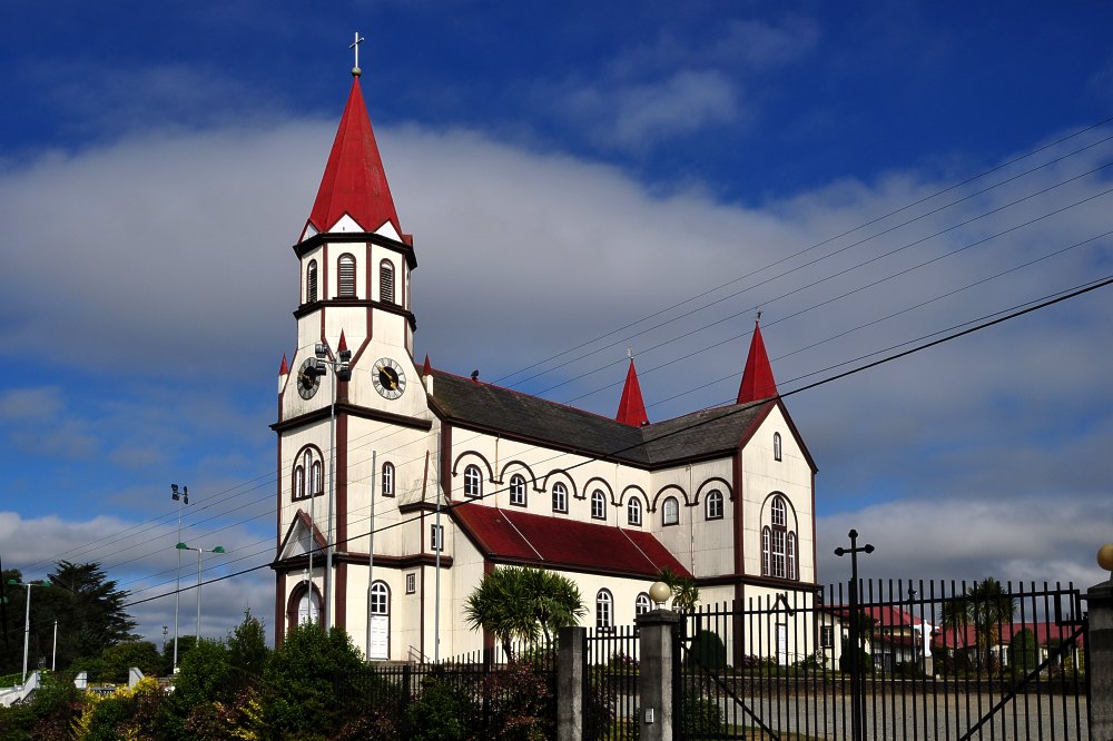(*) Ulmo es una planta arbórea que crece en el sur de Chile. Puede medir hasta 40m de altura. Tiene hojas pequeñas y de color verde oscuro y flores blancas. ~~ La conception de l'église du Sacré Cœur de Jésus est basée sur celle des églises du Baden Wurtemberg en Allemagne. Elle fut construite entre 1915 et 1918 par Edmundo Niklitschek et Bernardo Klenner. Sa structure est en bois d'ulmo* et de hêtre. L'intérieur est en manius** et en laurier. L'extérieur est recouvert de plaques de fer et le toit de bardeaux de mélèze. Elle a été déclarée Monument National du Chili en 1992. A ses pieds se trouve la grotte de la Vierge de Lourdes. *L'ulmo ( euchryphia cordifolia) est une plante arborée qui pousse dans le sud du Chili. Elle peut mesurer jusqu'à 40m de haut. Elle a de petites feuilles vert sombre et des fleurs blanches. **Le manius, appelé aussi if du Prince Albert, fait partie de la famille des podocarpes. |