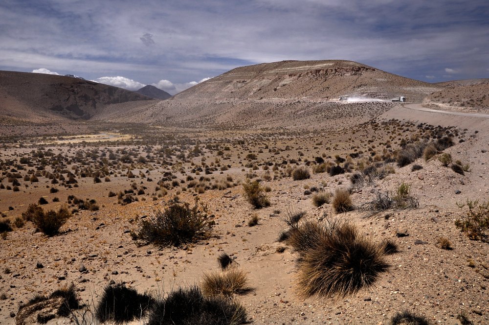 L’extrême nord du Chili. Un paysage lunaire, peu ou pas de végétation, des pistes sableuses ou boueuses selon les conditions météo et des camions, beaucoup de camions et, quand il n’y a pas de camions, des bulldozers qui refont la piste pour laisser passer encore plus de camions. Bienvenue sur la route du borax.