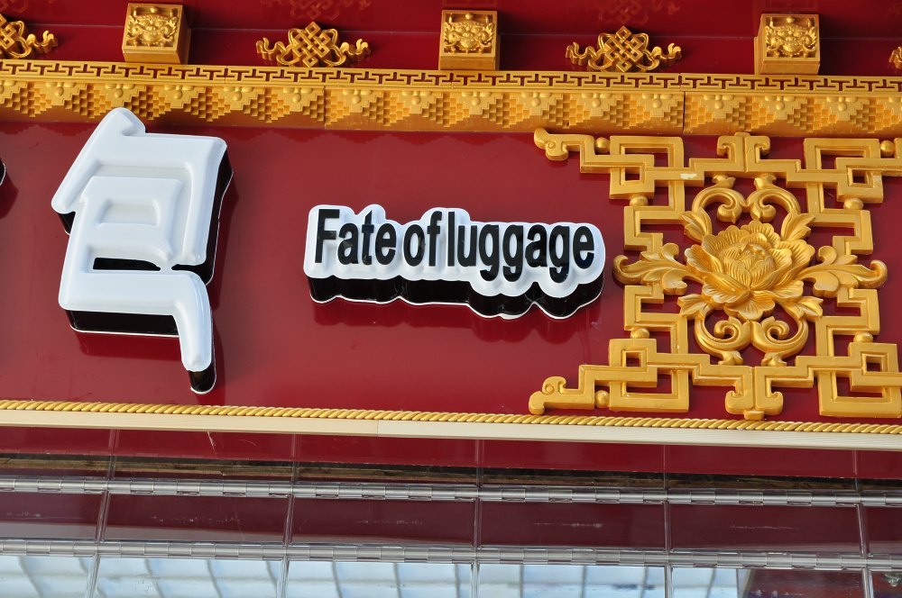 « Le funeste destin des valises » : enseigne d’un marchand de bagages. Dans un aéroport, ça n’est pas rassurant.