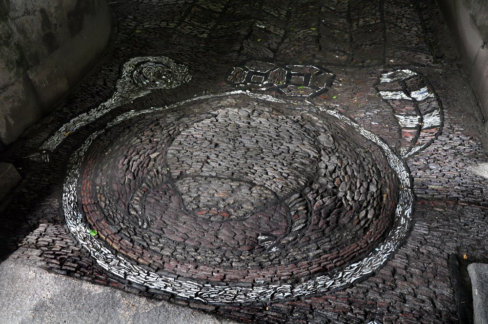 Au sol de la galerie qui mène vers le Pavillon pour Admirer la Grande Rocaille, on marche sur un étrange tableau de pierres.