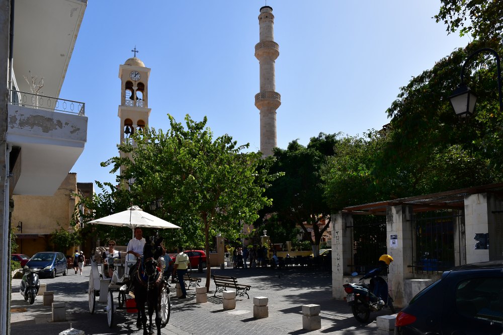 La place Splantzia, l'église Saint Nicolas et le minaret de la mosquée Houghiar Tzamissi.