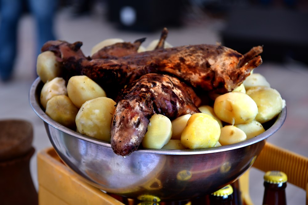 Pommes de terre bouillies et cuy grillé (cochon d'Inde) attendent d'être servis.