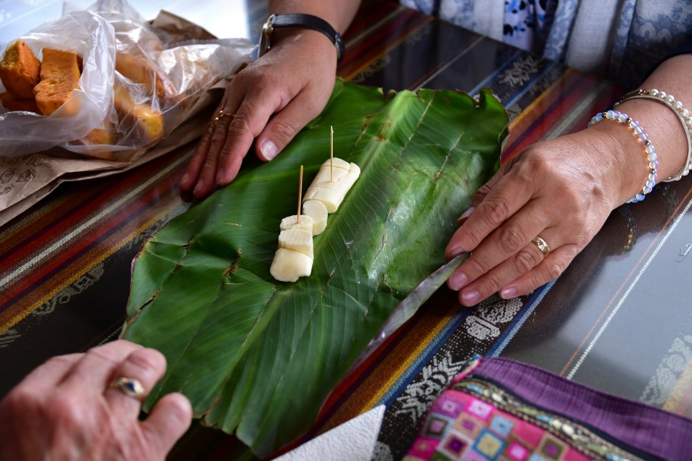 Spécialité de la région de Cayembe : Fromage de lait de bufflonne enveloppé dans des feuilles de bananier et servi avec des biscochos, biscuits secs.