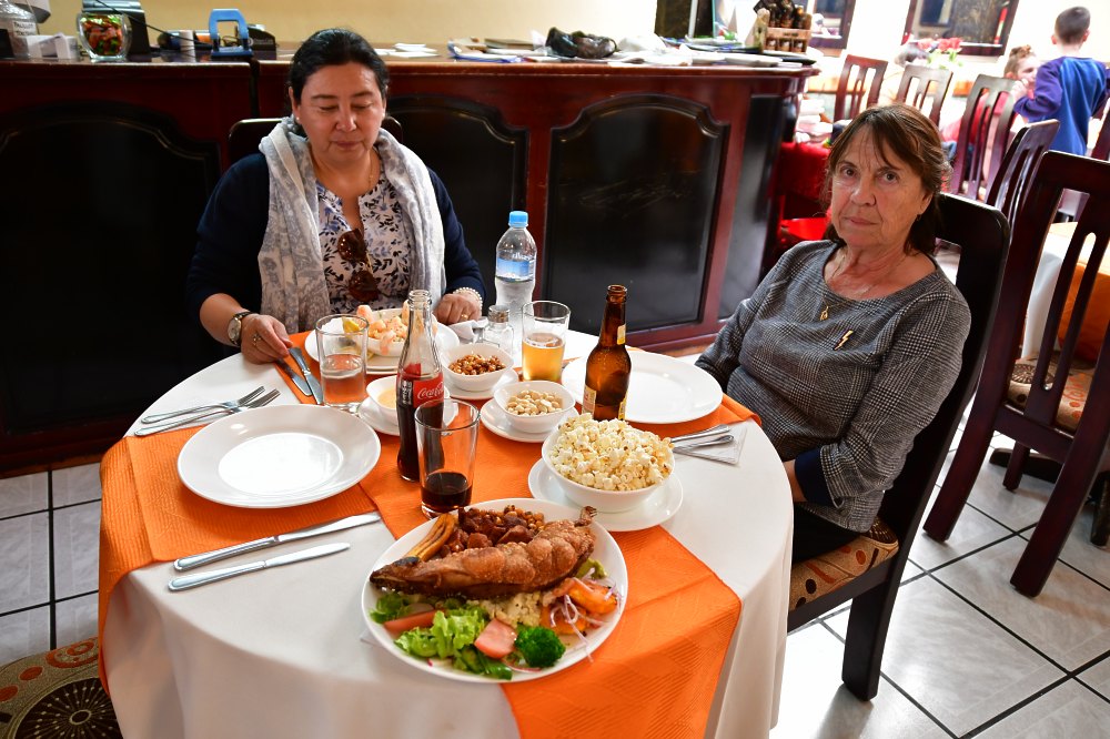 Mangeons typique : Cochon d'Inde, fritadas, banane plantain, légumes verts en salade et maïs soufflé.