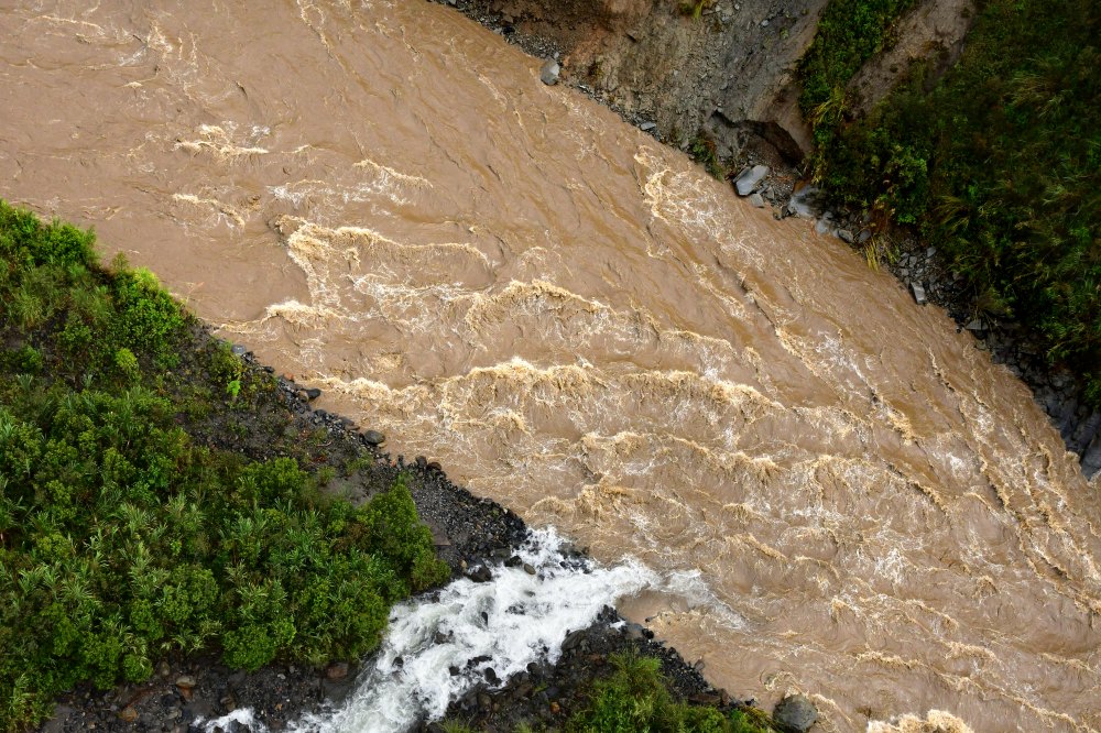 Quatre cent cinquante mètres de tarabita mènent juste au-dessus du pied de la cascade qui se déverse dans le Rio Pastaza.