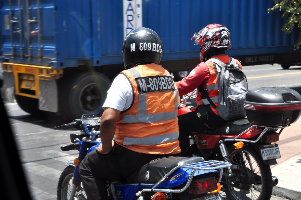 La règle à Cuidad Guatemala : les conducteurs de deux roues doivent porter sur le dos et sur le casque l’immatriculation de leur engin.