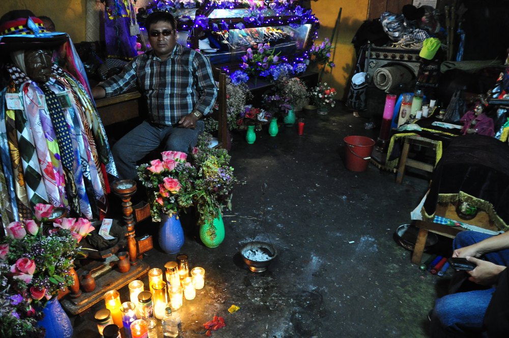 Divinité maya à deux facettes, Maximón représente à la fois le bien et le mal. C’est un saint et un débauché à qui on demande protection et faveurs en lui achetant de l’alcool et des cigares. Comment vénérer un tel personnage dans un cadre catholique traditionnel ? Tout d’abord, on lui donne deux noms : Maximon dans les familles et Saint Simon à l’église. Surtout on s’applique à le traiter de façon "respectable" dans les lieux de culte officiels et "à la Maya" dans les sanctuaires privés, comme celui que nous visitons aujourd’hui.
