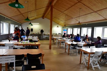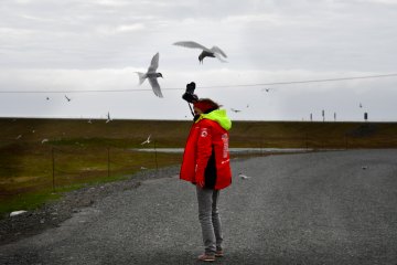 Nous subissons une attaque en règle de la part de sternes qui n'apprécient pas notre présence. Nous reprenons la route vers la lagune de Fjallsarlon visitée sous une pluie battante. Petit arrêt à la charmante église de Hof où le pasteur, qui est une femme, attend les futurs mariés sous la pluie. Camping à Svinafell, dans la boue, 3200kr, douche gratuite, un bonus. La salle commune, où tout le monde se retrouve pour échapper aux intempéries, est très grande et bien chauffée.