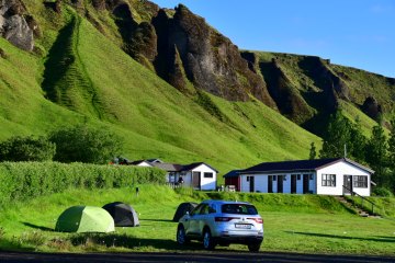 5h30, 6° dehors. Parc National du Vatnajokull. Deux belles randonnées: Svartifoss, Sjonasker, la bergerie de Sel puis le glacier Skaftafell. Route entre sandar et langues glaciaires. Arrêt à Kirkjubaejarklaustur. Quelques courses au supermarché Kjarval, premier plein d'essence à la station N1, 9596kr. Nous devons demander de l'aide car tout est en islandais. En fait, il y avait une touche pour sélectionner la langue mais elle était aussi en islandais. Arrêt sous une pluie battante au camping décevant de Horgsland, 3200kr, un tout petit bloc sanitaire, un jaccuzi, 12°.