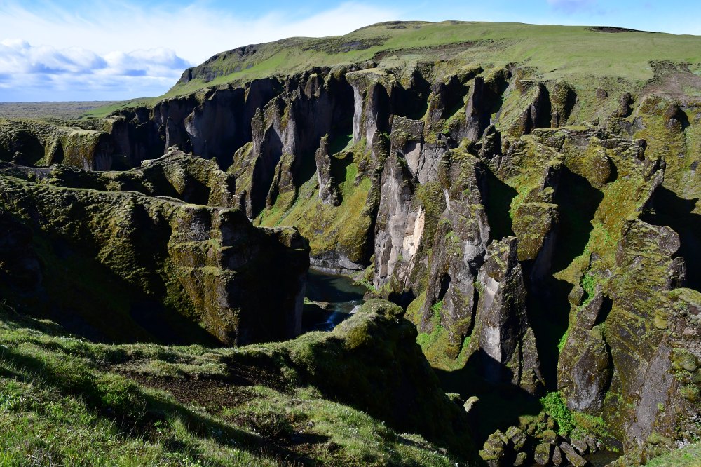 Le sentier offre des vues spectaculaires sur les murailles sombres du canyon.