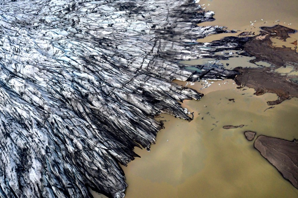 Vus du ciel les glaciers sont striés de cendres.
