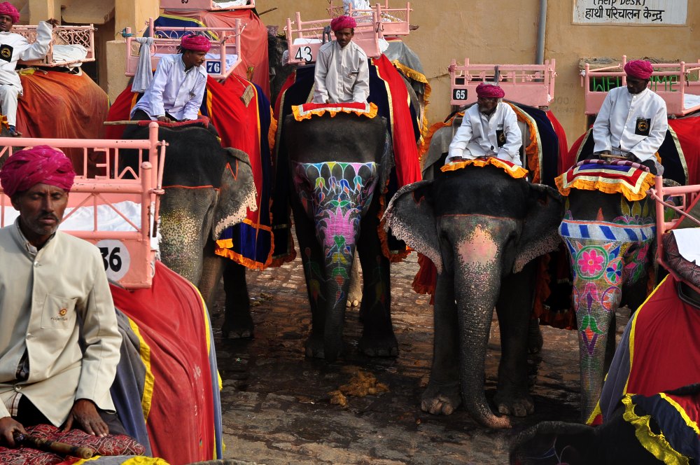 Les éléphants sont conduits par des mahouts. Ils ne sont pas propriétaires des animaux. Ce sont des professionnels, sortes de « camionneurs » de pachydermes. Les passagers, deux par équipage, sont assis dans la nacelle, le howdah.