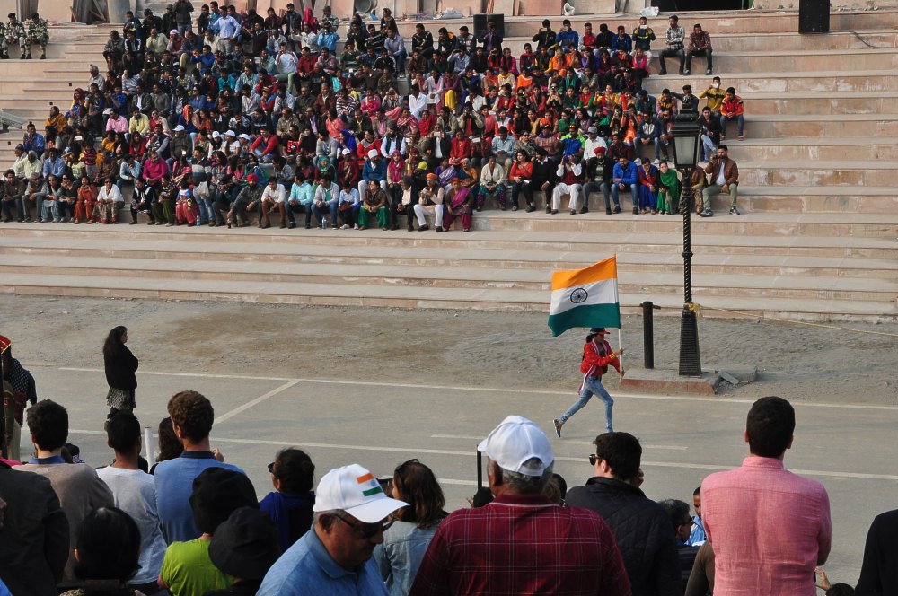 Pendant les deux heures d’attente, les gradins se remplissent et tous ceux qui ont fait le voyage expriment leur fierté d’être indien. On court en agitant des drapeaux, on chante, on fait des olas, on danse, le tout dans un bruit assourdissant de haut-parleurs qui mélangent les chants nationalistes, les hymnes régionaux et les tubes à la mode.