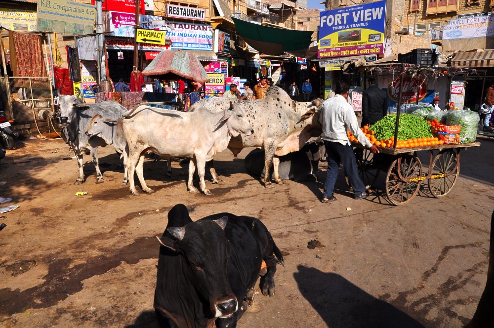 Le marché s’installe. Les vaches attendent patiemment, elles savent qu’elles seront servies. Pour les Hindous elles représentent la divinité nourricière. On leur donne à manger et à boire chaque jour. A la fin de la journée on leur laissera les invendus mais avant cela chaque ménagère qui fait ses courses leur donnera au passage un petit quelque chose.
