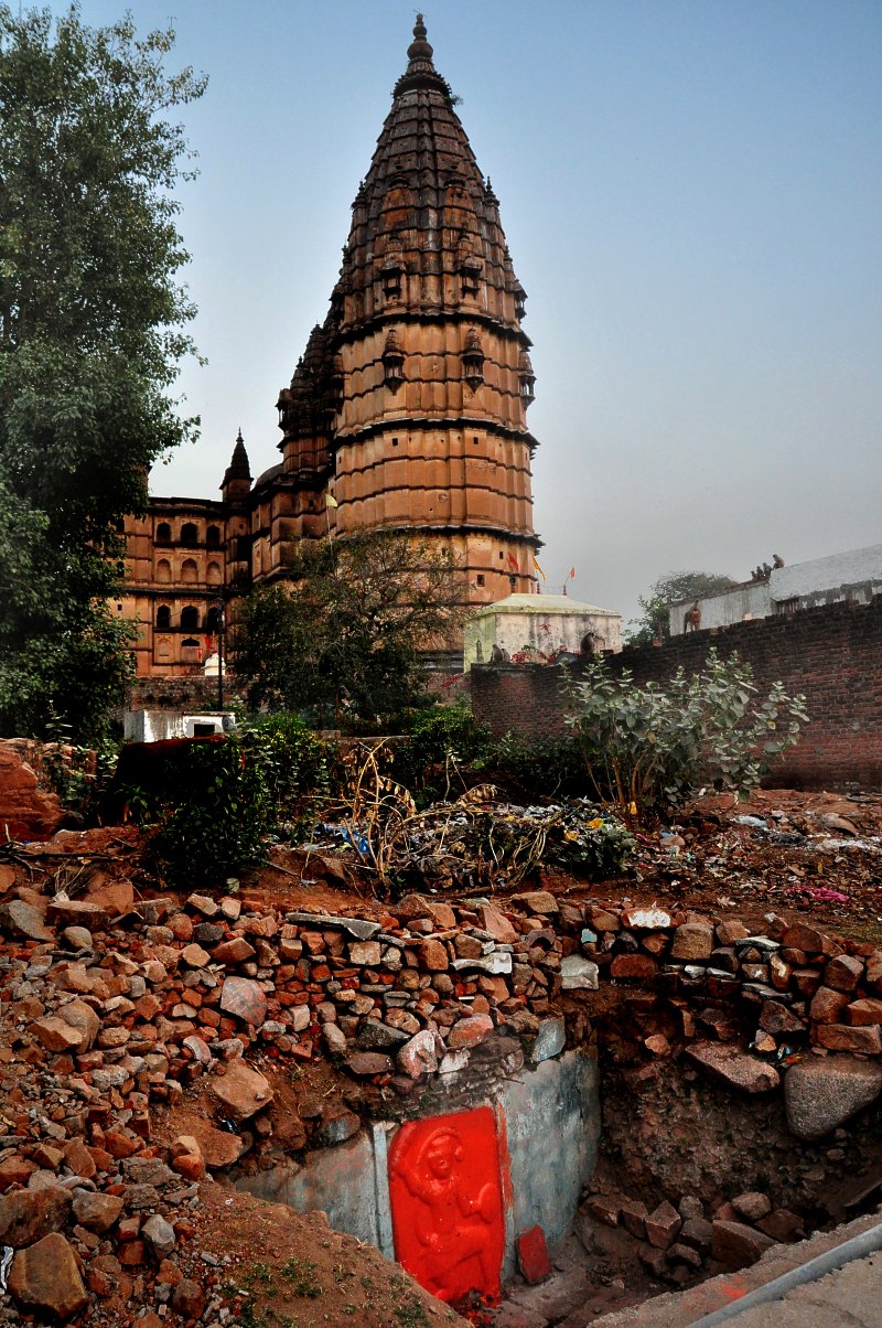 Stèle dédiée à Hanuman, le dieu singe non loin du shikara conique du temple de Vishnou.