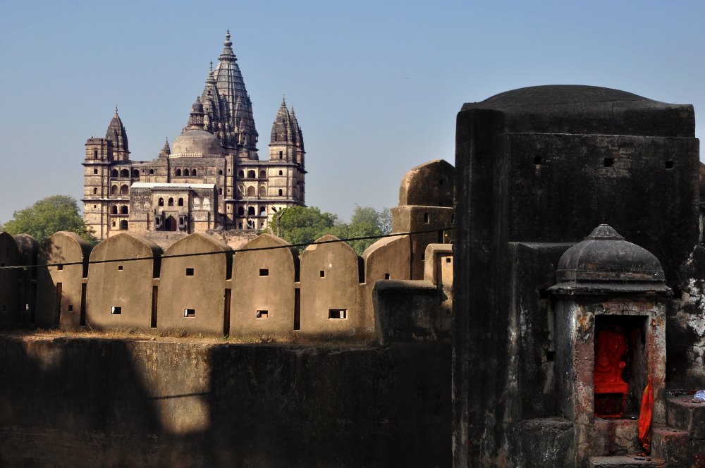 Vue sur le Chaturbhuj Mandir avec sa haute shikhara, tour conique qui mesure plus de 30 mètres.
