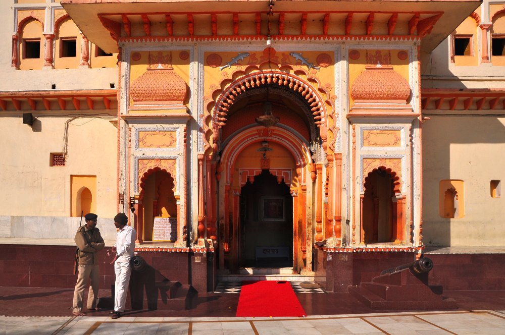 Entrée de l’ancien palais transformé en temple de Rama à la suite d’une prophétie. Chaque soir, les fidèles viennent rendre hommage à la statue de Rama. Le militaire, présent devant la porte, demeure alors au garde-à-vous devant le dieu statufié pendant toute la cérémonie.