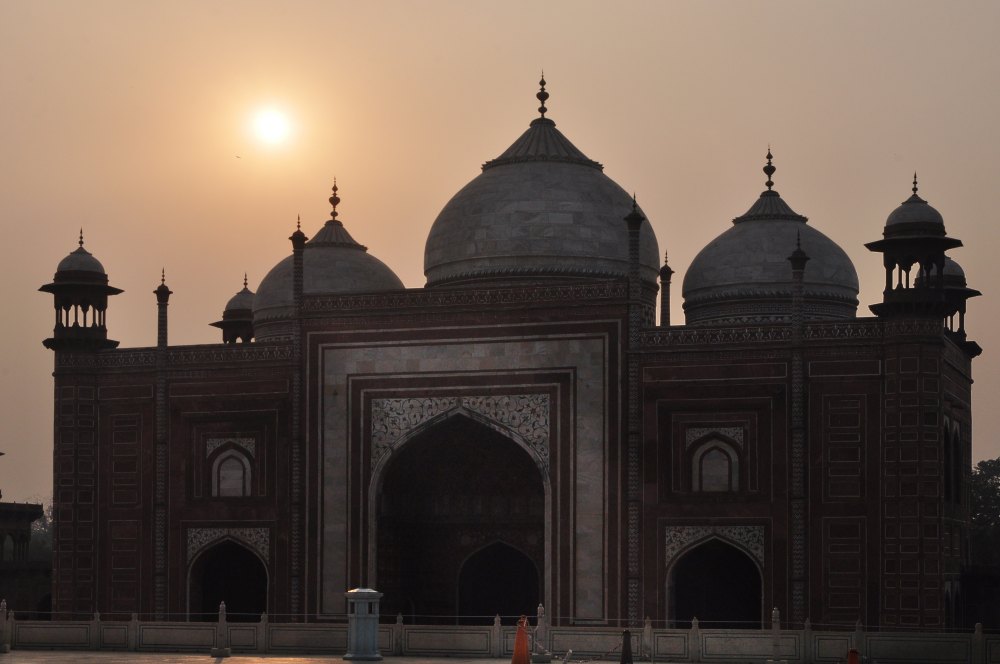 Les pinacles à boules dorées se découpent contre le soleil couchant au sommet du dôme de la mosquée.