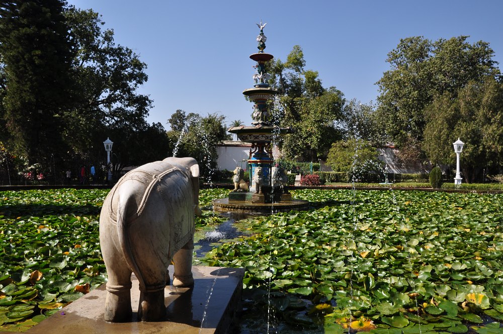 Le bassin en forme de fleur de lotus est agrémenté d’une fontaine venue tout droit d’Angleterre et d’éléphants de marbre crachant l’eau par leur trompe.