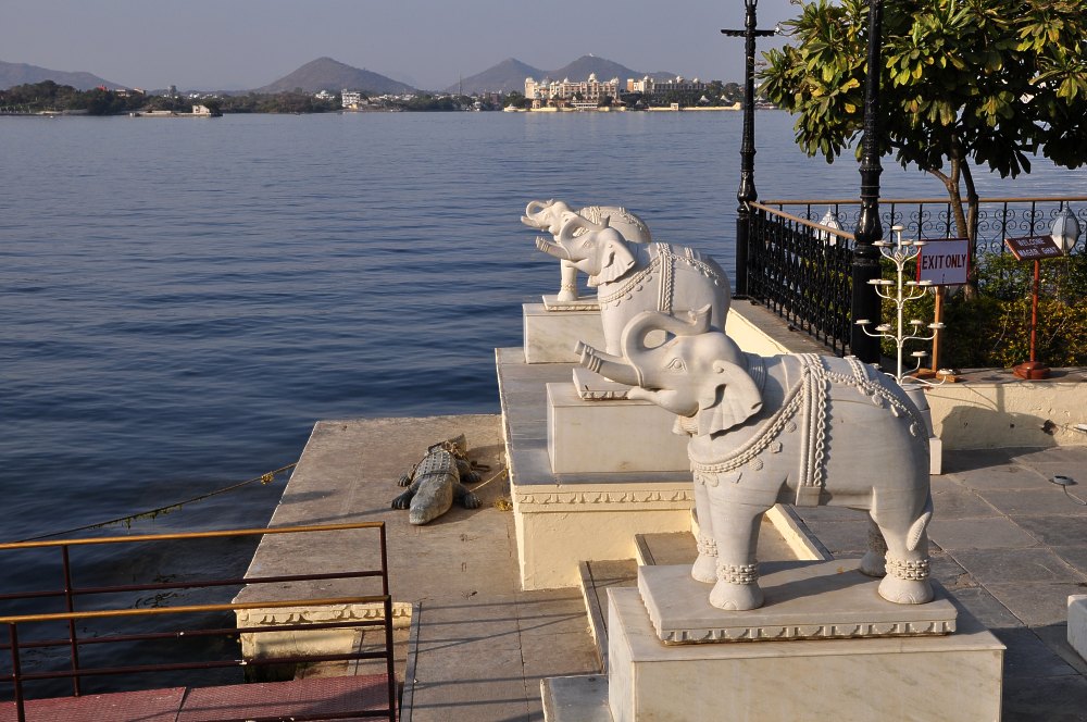 L’une des deux îles formées à la création du lac, Jag Mandir, abrita Shah Jahan, qui s’est inspiré de son petit palais pour le Taj Mahal, d’après la légende. On y accède en bateau. Un restaurant et un hôtel au milieu de petits jardins accueillent de nos jours les clients fortunés et les visiteurs occasionnels.